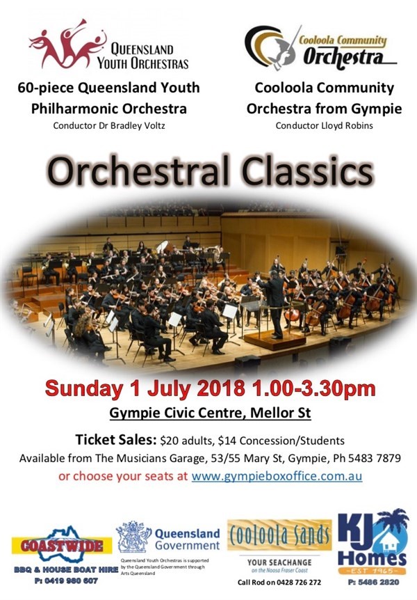The 60-member Queensland Youth Philharmonic Orchestra conducted by Dr Bradley Voltz and the Cooloola Community Orchestra conducted by Lloyd Robins present a feast of popular orchestral classics.