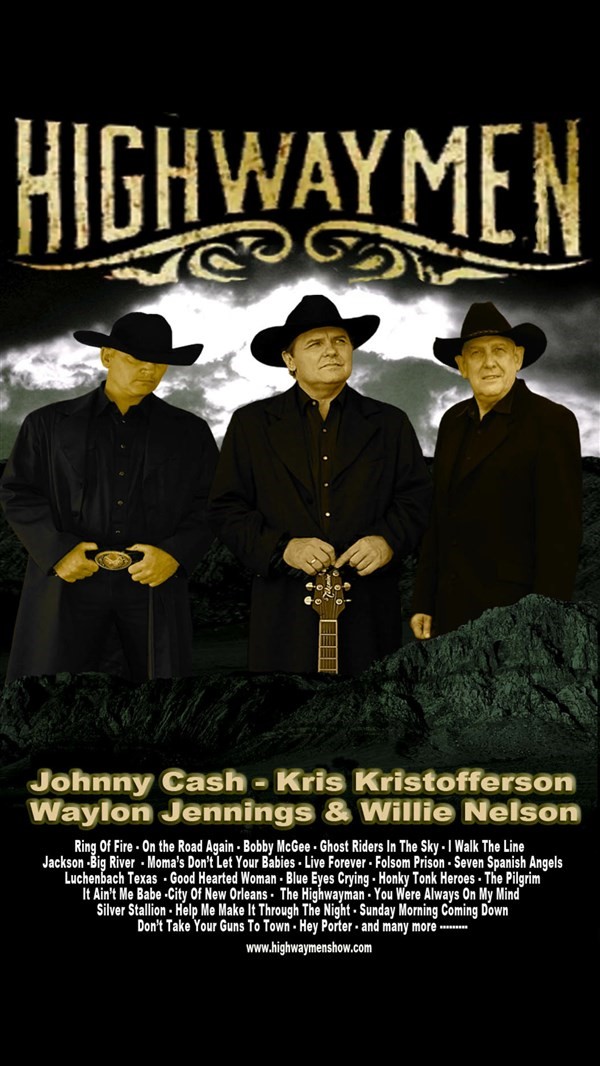 The show features a great musicianship with pedal steel guitar, acoustic and electric guitars, drums, banjo, mandolin, fiddle and harmonica. THE HIGHWAYMEN tribute show is a musical and visual re-creation - right down to their desert backdrop and the trademark rifle coats. This level of professionalism has really hit the mark with the audiences.